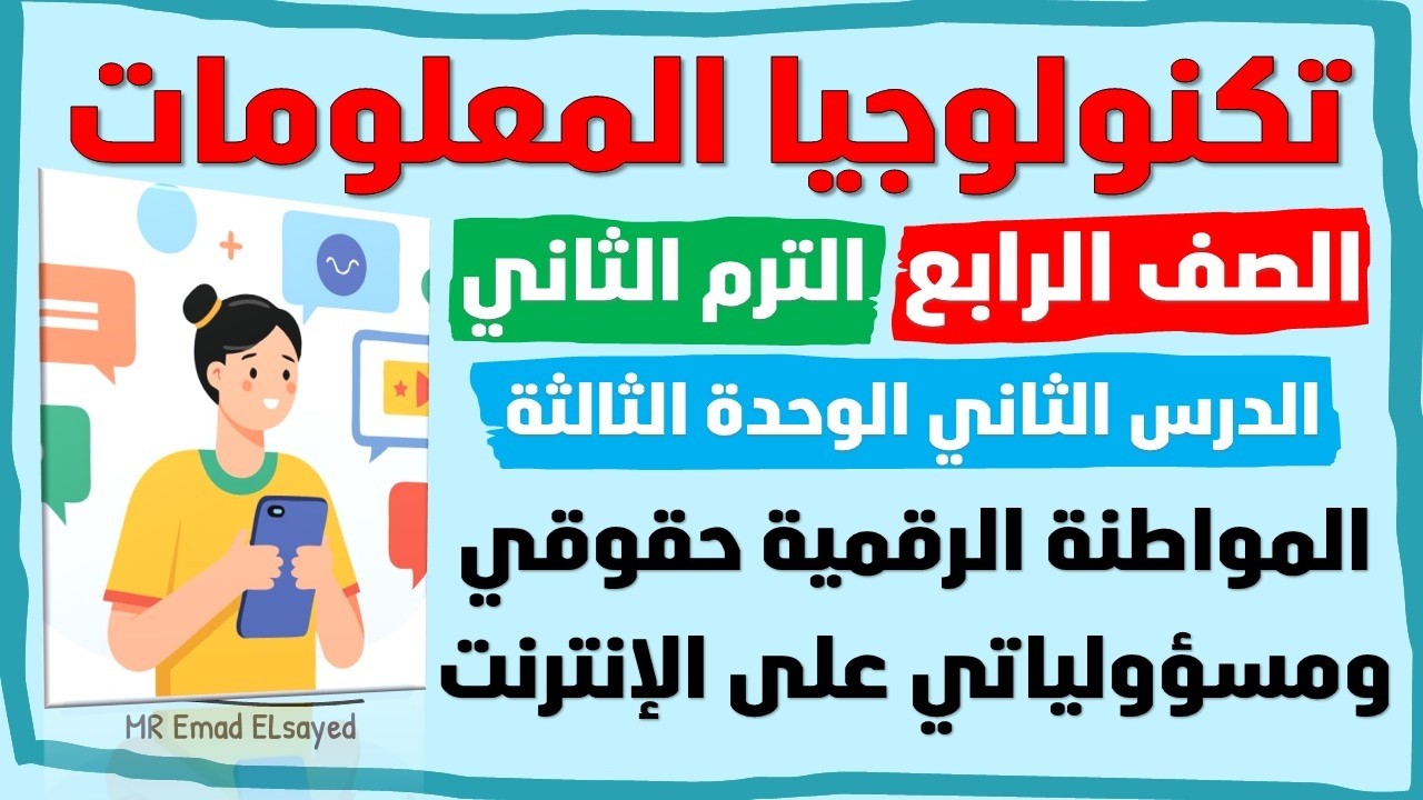 اهلا بكل متابعي قناة افهم تكنولوجيا مع مستر عماد السيد النهاردة مع شرح مادة تكنولوجيا المعلومات والاتصالات وشرح درس المواطنة الرقمية حقوقي ومسؤولياتي على الإنترنت من منهج تكنولوجيا المعلومات والاتصالات للصف الرابع الابتدائي الترم الثاني الفصل الدراسي الثاني المنهج الجديد، بأسلوب مبسط وسهل يناسب طلاب ابتدائي مع أمثلة من الحياة اليومية تساعد الطفل على فهم معنى البصمة الرقمية، حقوق المواطن الرقمي، المسؤوليات على الإنترنت، قواعد الاستخدام الآمن، وأهمية احترام الملكية الفكرية وتجنب القرصنة. شرح شامل يساعد الطلاب على الفهم والحفظ وحل تقييمات وزارة التربية والتعليم بسهولة.