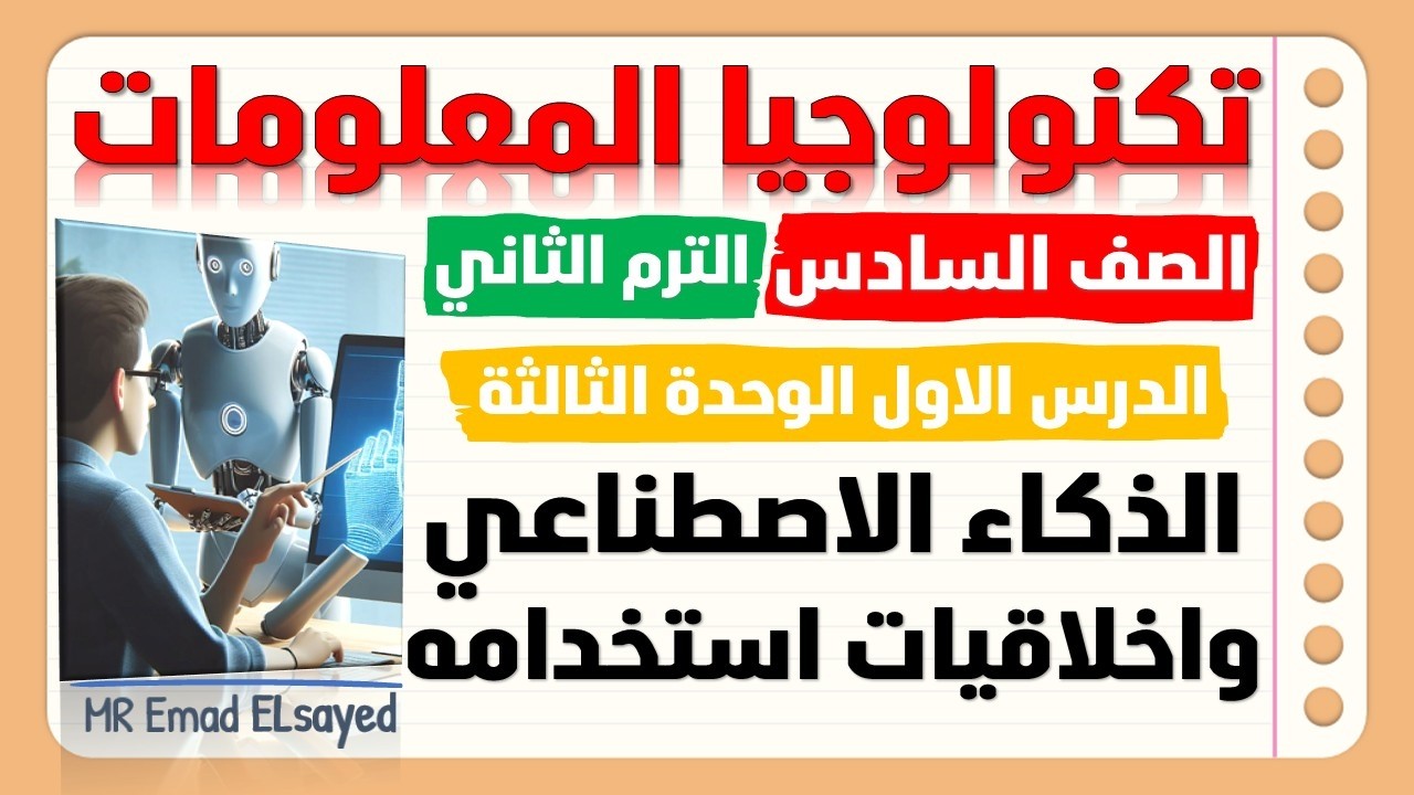 اهلا بكل متابعي قناة افهم تكنولوجيا مع مستر عماد السيد النهاردة مع شرح مادة تكنولوجيا المعلومات والاتصالات الصف السادس الابتدائي الترم الثاني – الدرس الأول: الذكاء الاصطناعي وأخلاقيات استخدامه بطريقة سهلة ومبسطة.